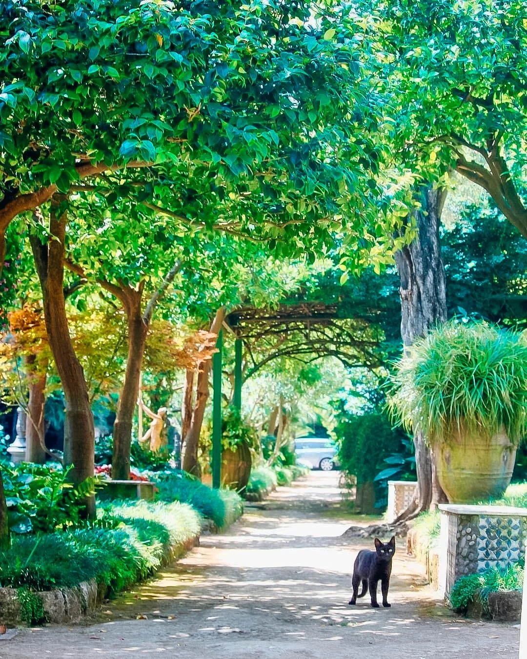 A peaceful garden pathway shaded by lush green trees and plants with a black cat standing on the path.