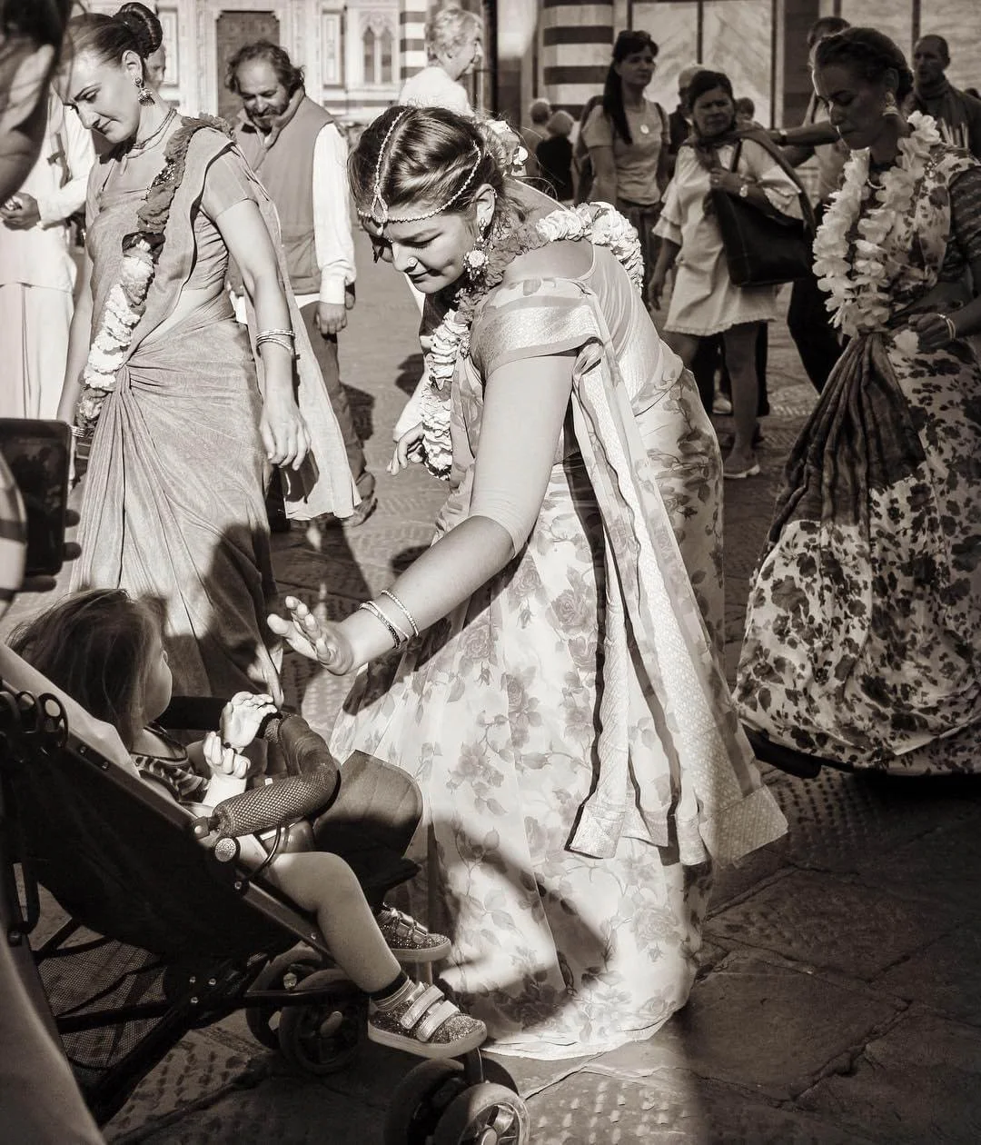 A woman dressed in traditional Indian clothing is touching the hand of a young girl sitting in a stroller. The scene appears to be at a cultural or religious festival with other women in similar attire and others in modern clothing in the background.