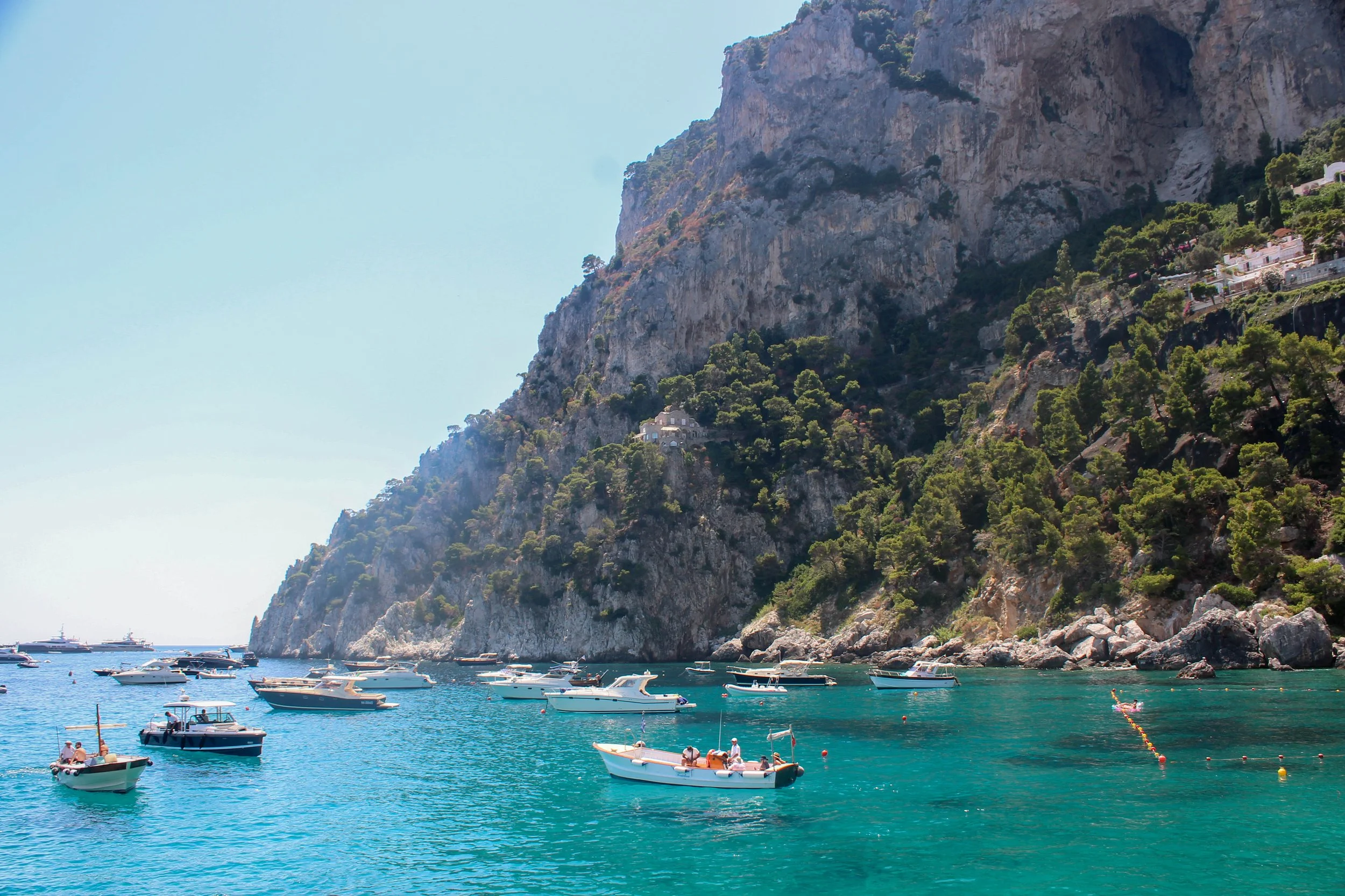 Boats floating in a turquoise bay near rocky cliffs and hillside with trees and houses.