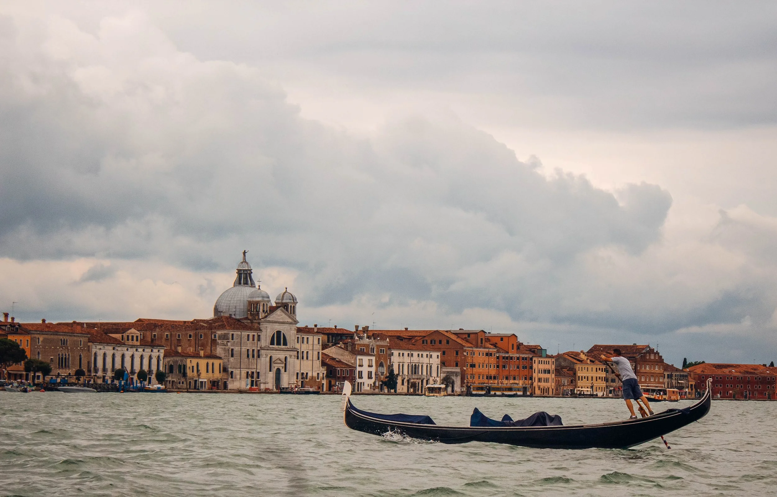 A gondola on the water with a man in Venice, Italy.