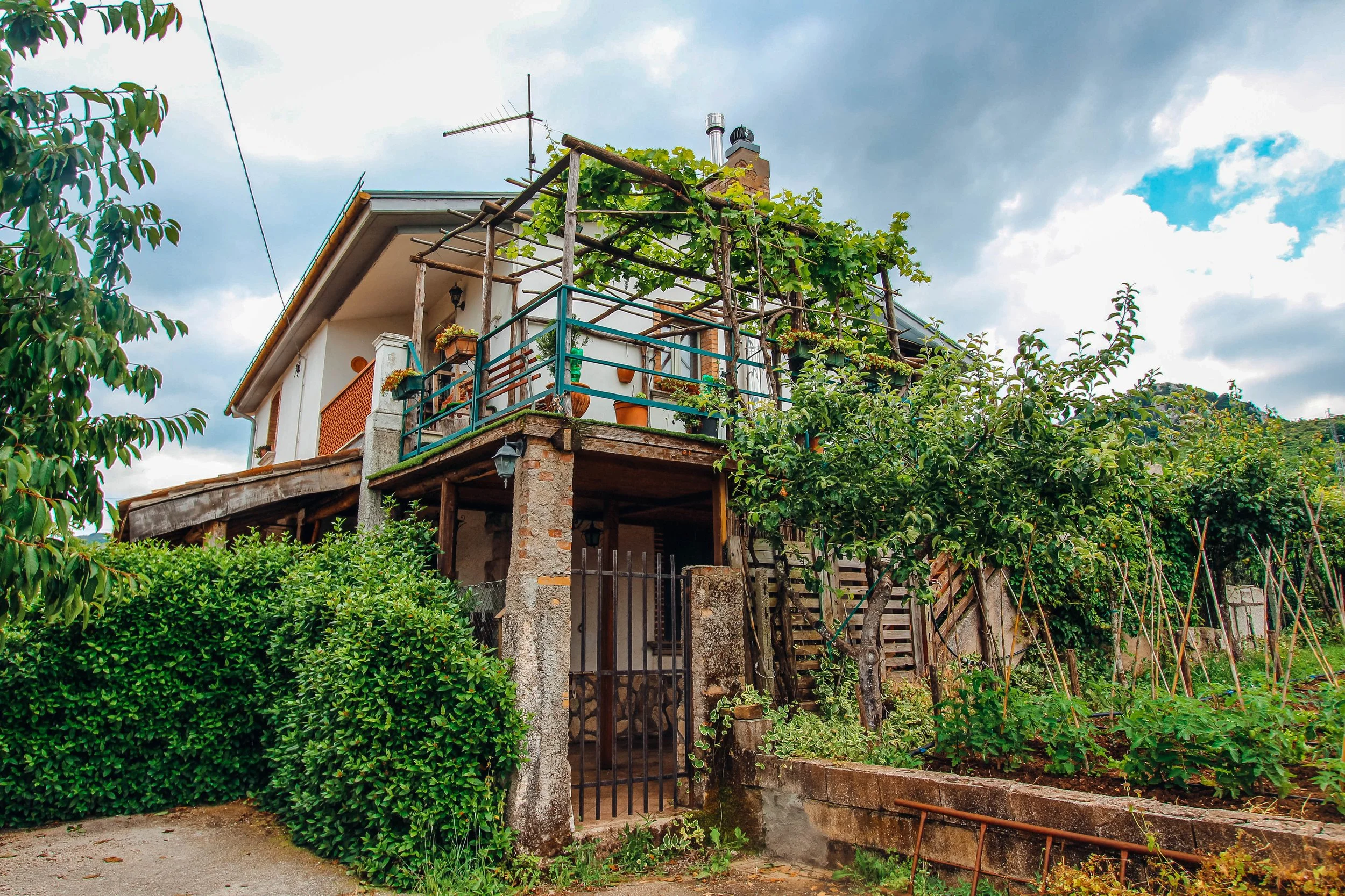 A two-story house with a wooden balcony on the second floor, surrounded by greenery and garden plants, with a cloudy sky in the background.