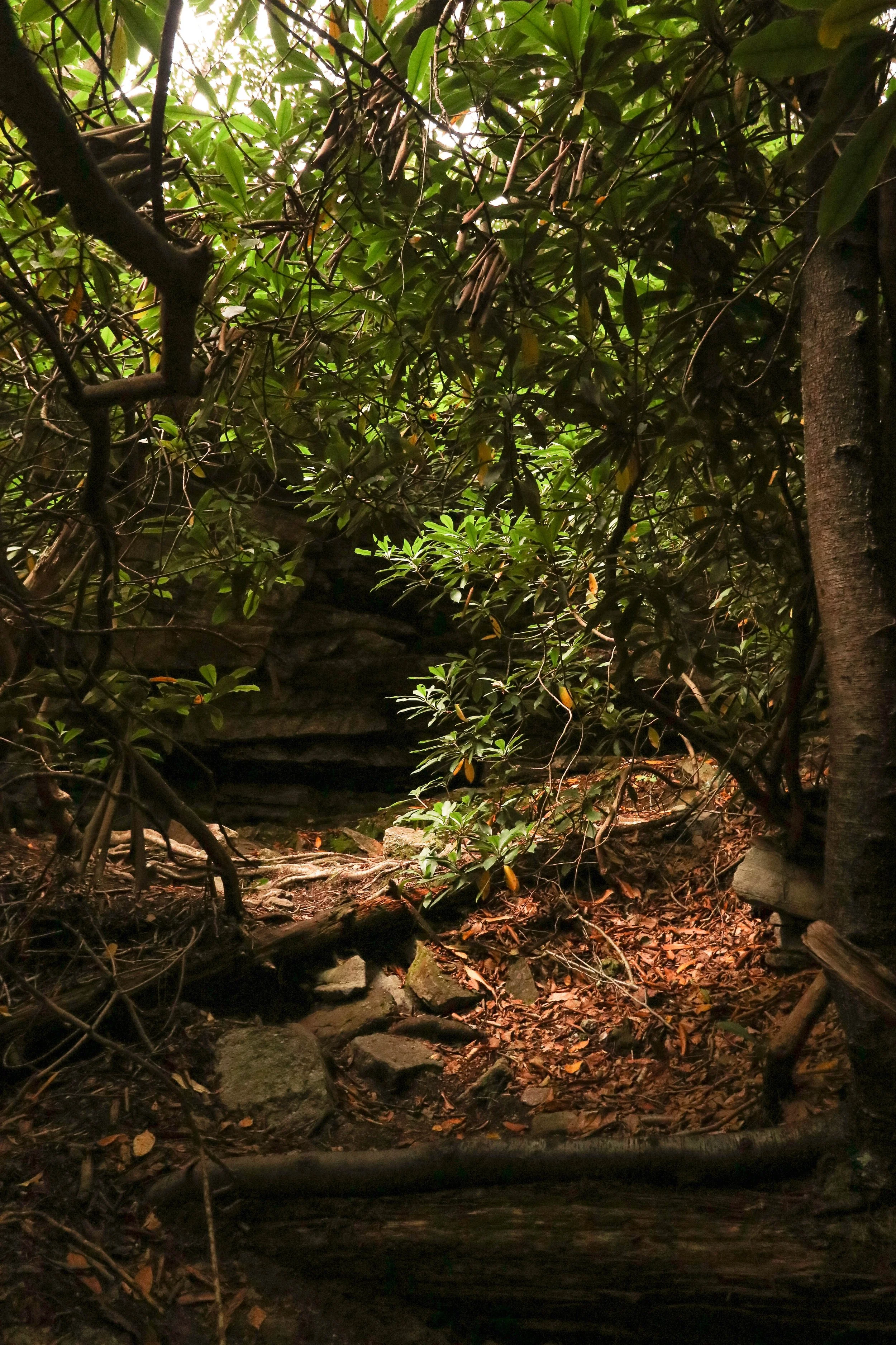 Dense forest with thick green foliage, tree roots, and a rocky pathway.