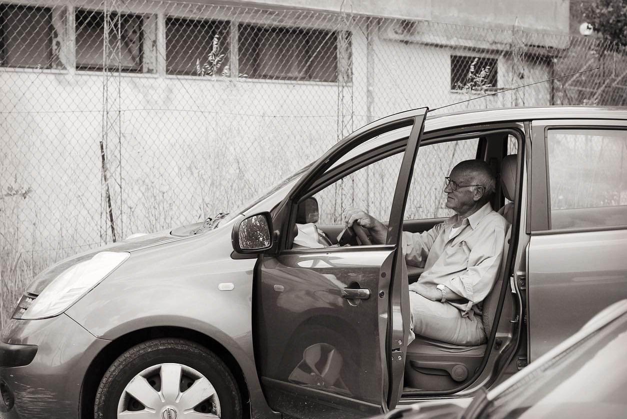 An elderly man with glasses and a watch, sitting in the driver's seat of a parked car with the door open in Italy.