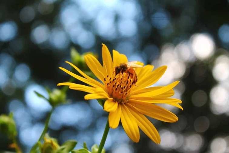 Close-up of a yellow flower with a bee collecting nectar, with blurred greenery in the background.