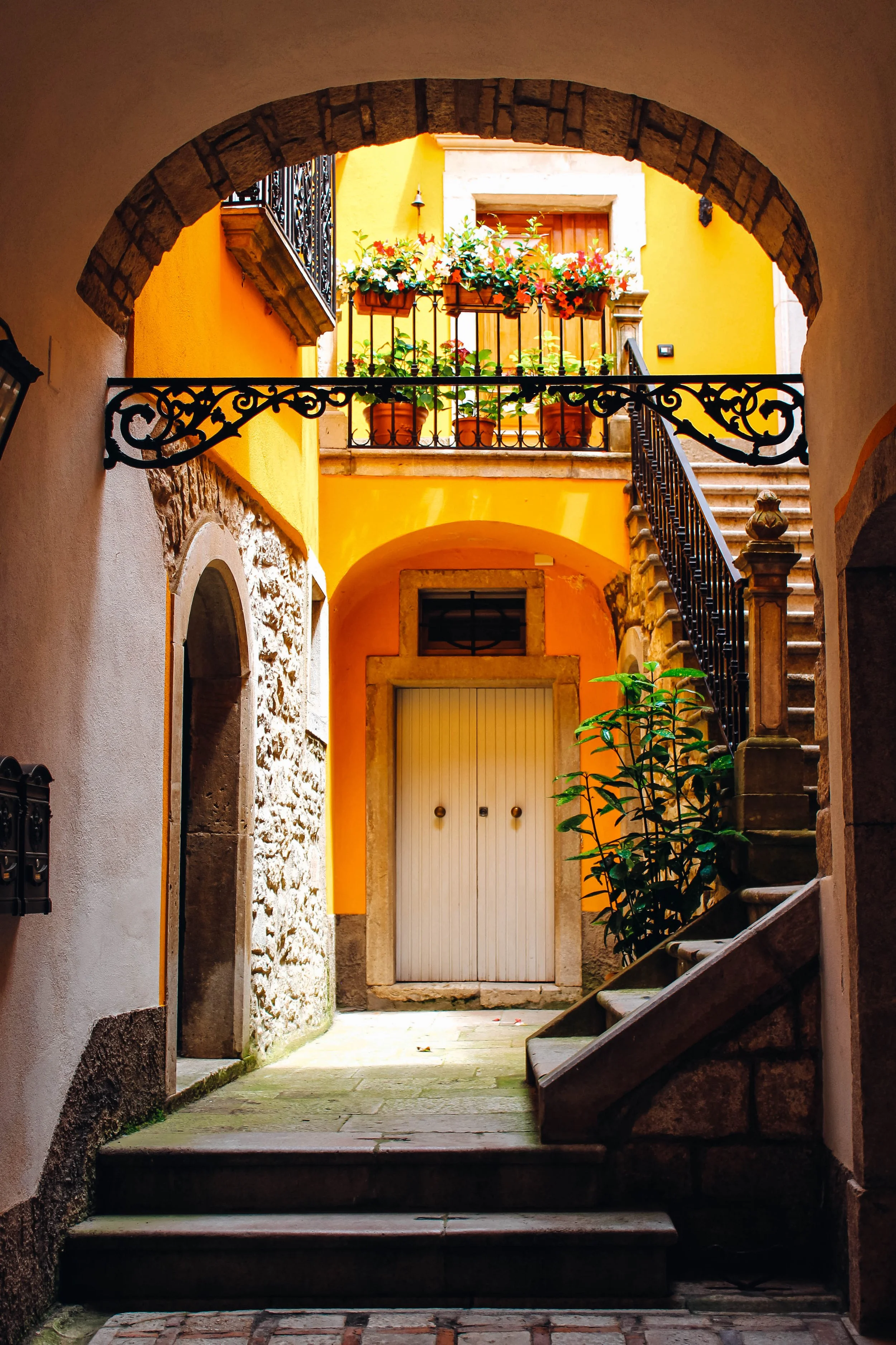A view through an arched stone passageway into a courtyard with yellow walls, stone stairs, and potted plants on a balcony.