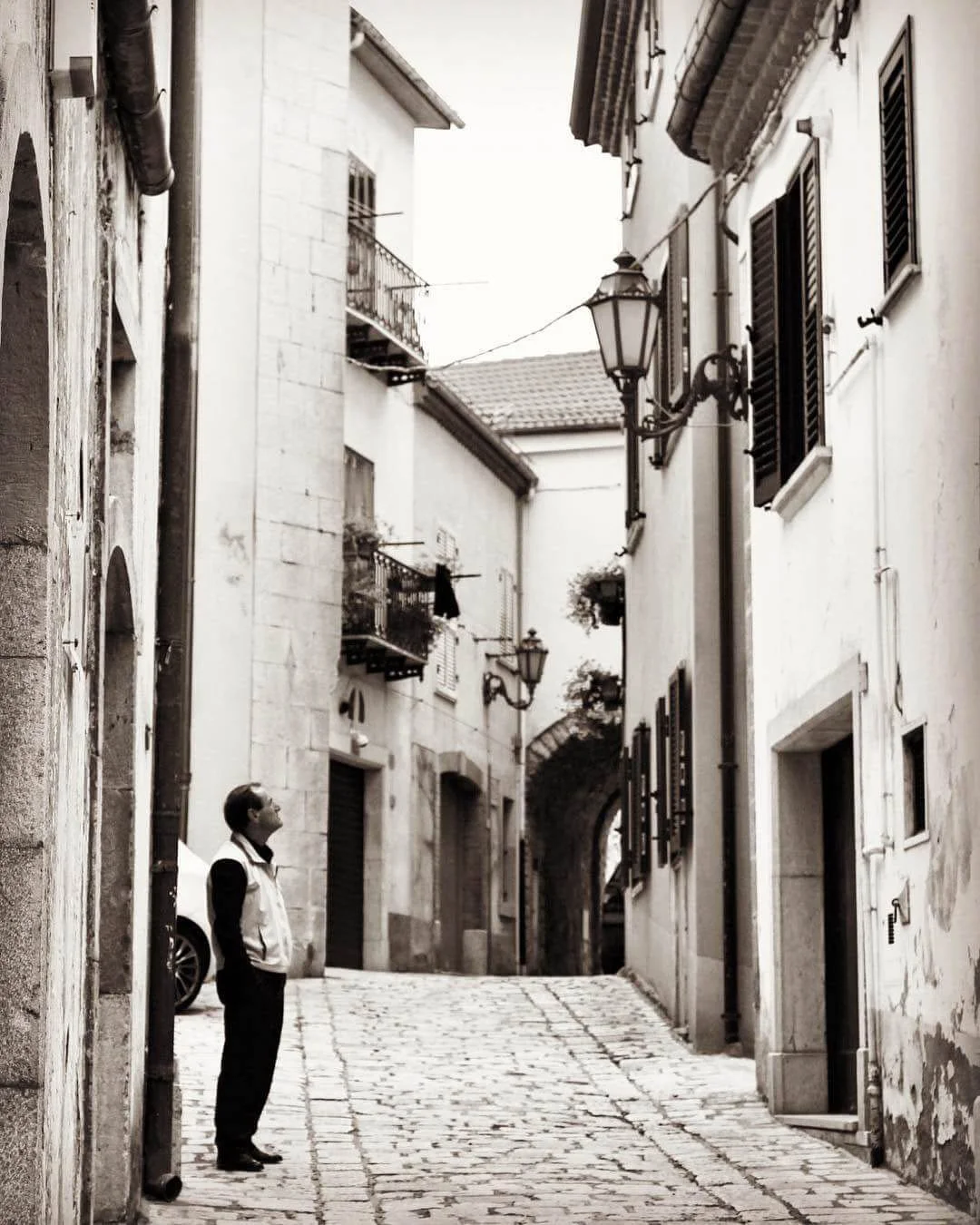 A man standing on a cobblestone street in a European city, looking up at the buildings and sky, with narrow buildings and vintage street lamps lining the street.