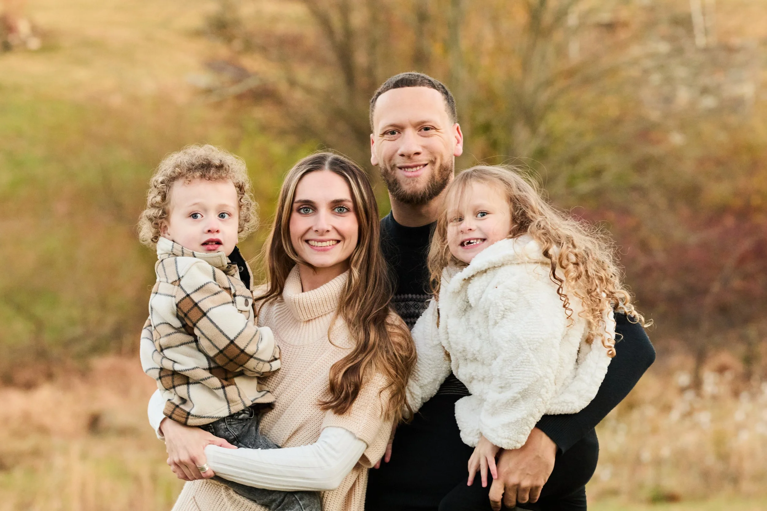 A family of four outdoors during autumn in a wooded park, with children being held by their parents.